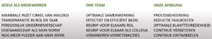 Tijdens de interactieve workshop werd het dagelijkse werk op de afdeling centraal gezet. De trainer nam de deelnemers eerst mee naar de invloed die wij op ons werk kunnen hebben en die is groot. De cirkel van invloed werd hierbij toegelicht: “Het beste resultaat halen we, naast ons vakmanschap, uit ons gedrag. Neem jouw rol, werk zoveel mogelijk samen, help elkaar en spreek elkaar op een respectvolle manier aan als zaken niet gebeuren die wel zijn afgesproken. Maak de oranje cirkel (van invloed) zo groot mogelijk! Het wijzen naar elkaar en excuses zoeken behoren niet meer in de professionele aanpak binnen ons bedrijf.”